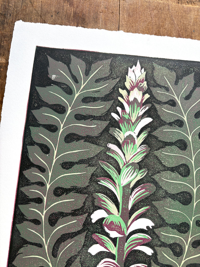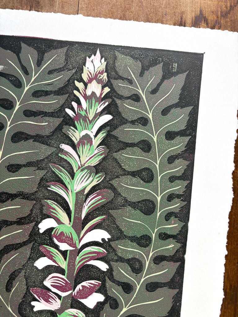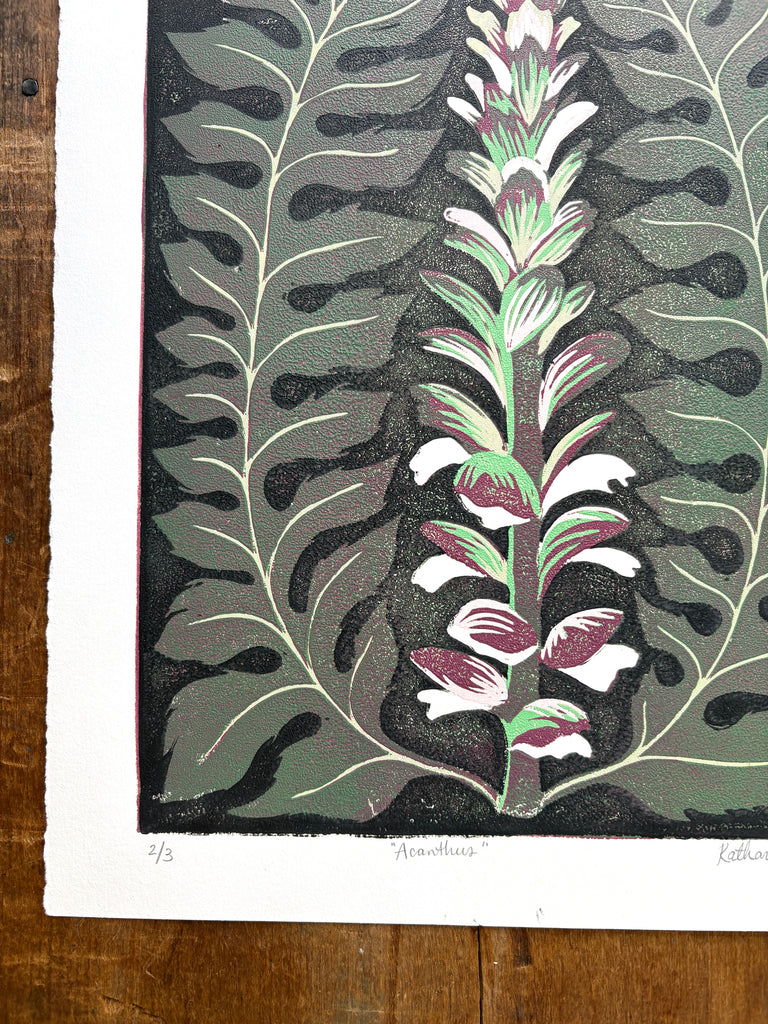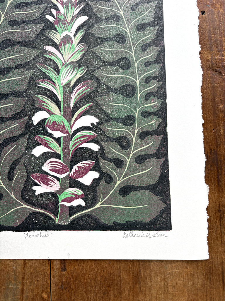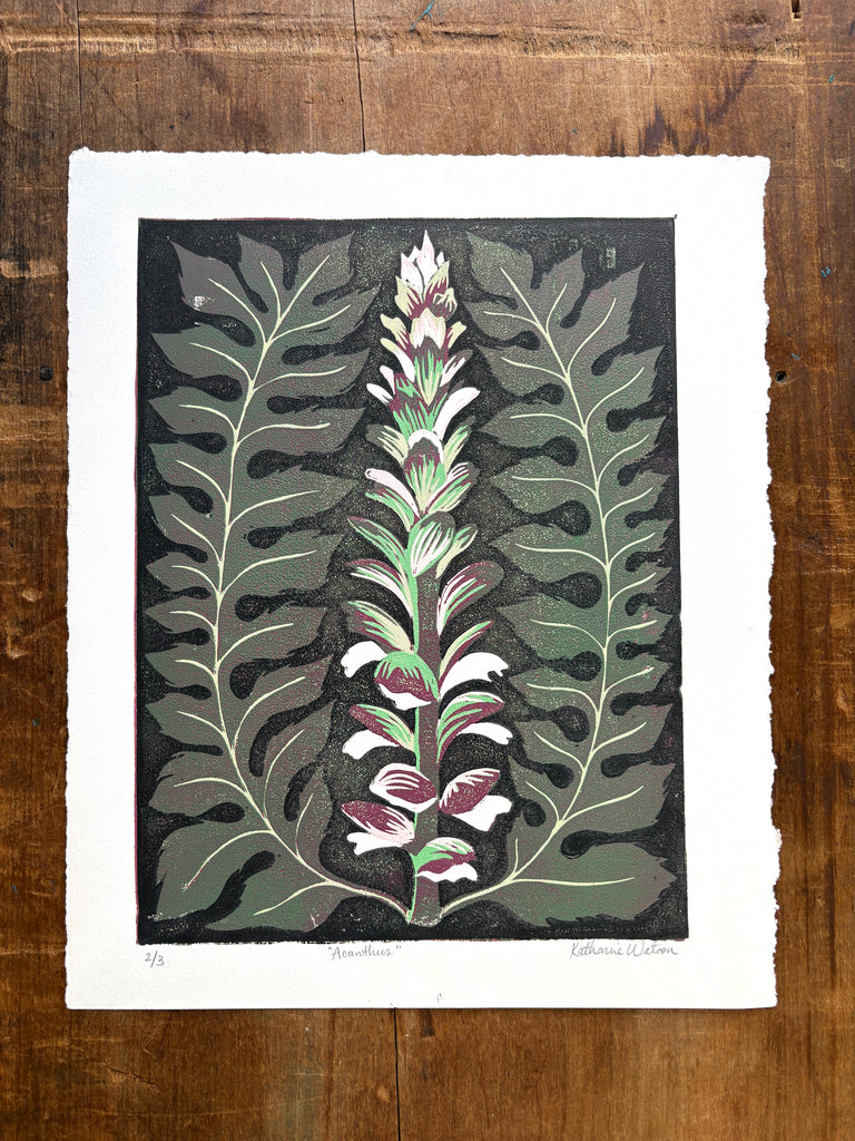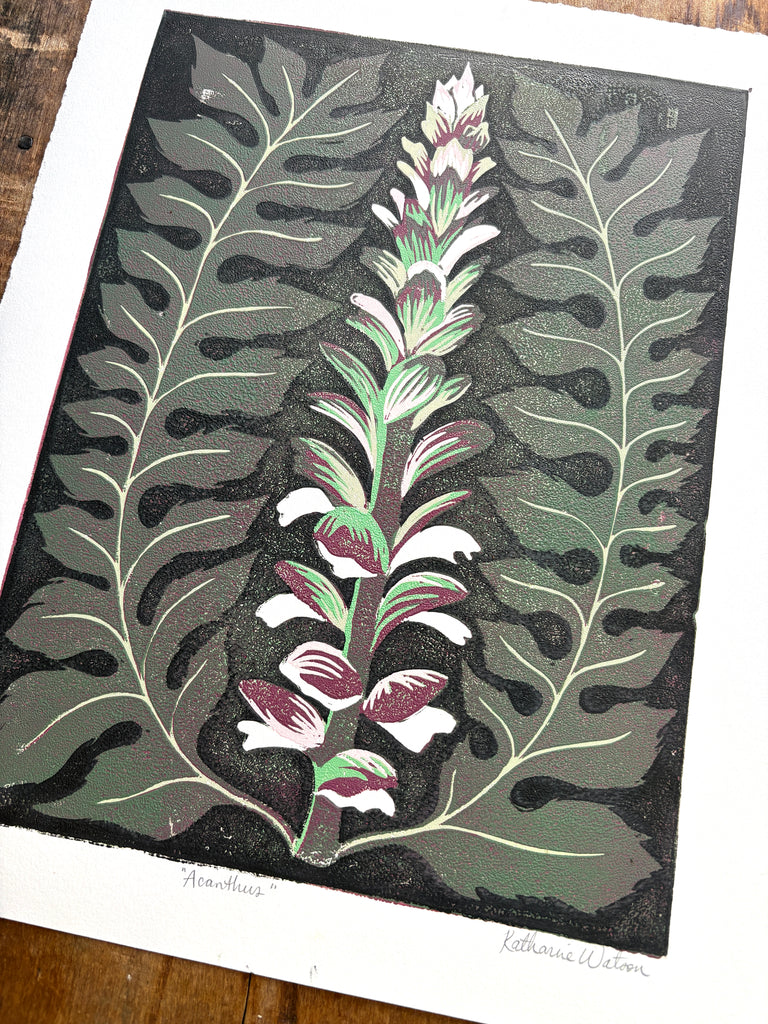 An original Katharine Watson reduction block print featuring an Acanthus plant.