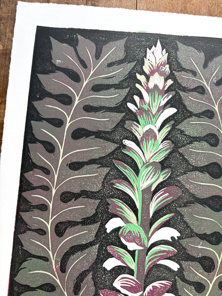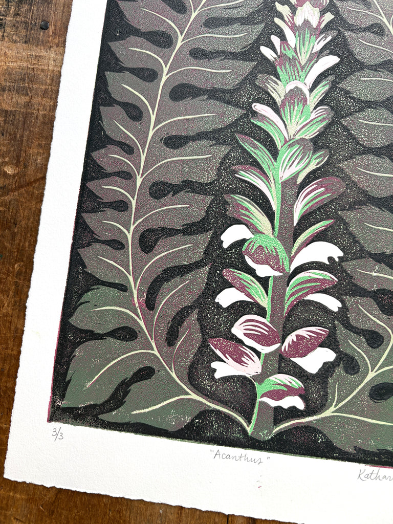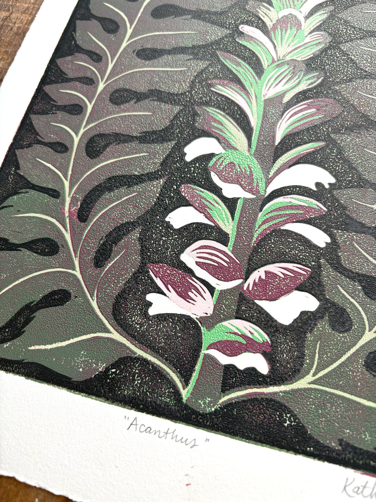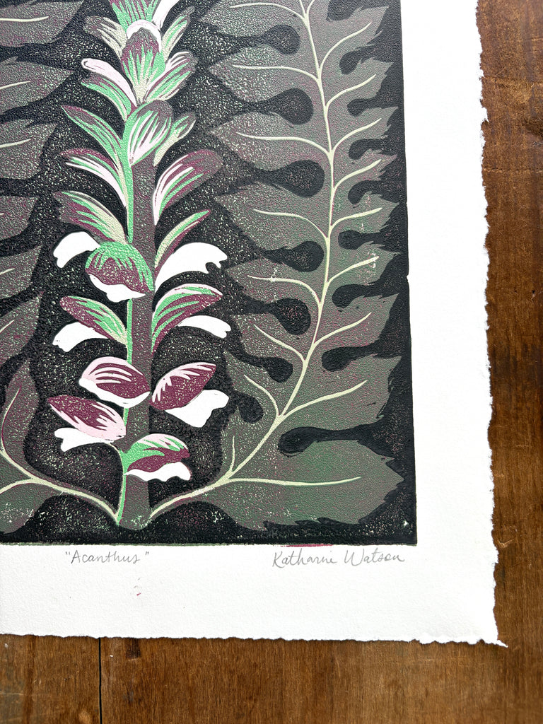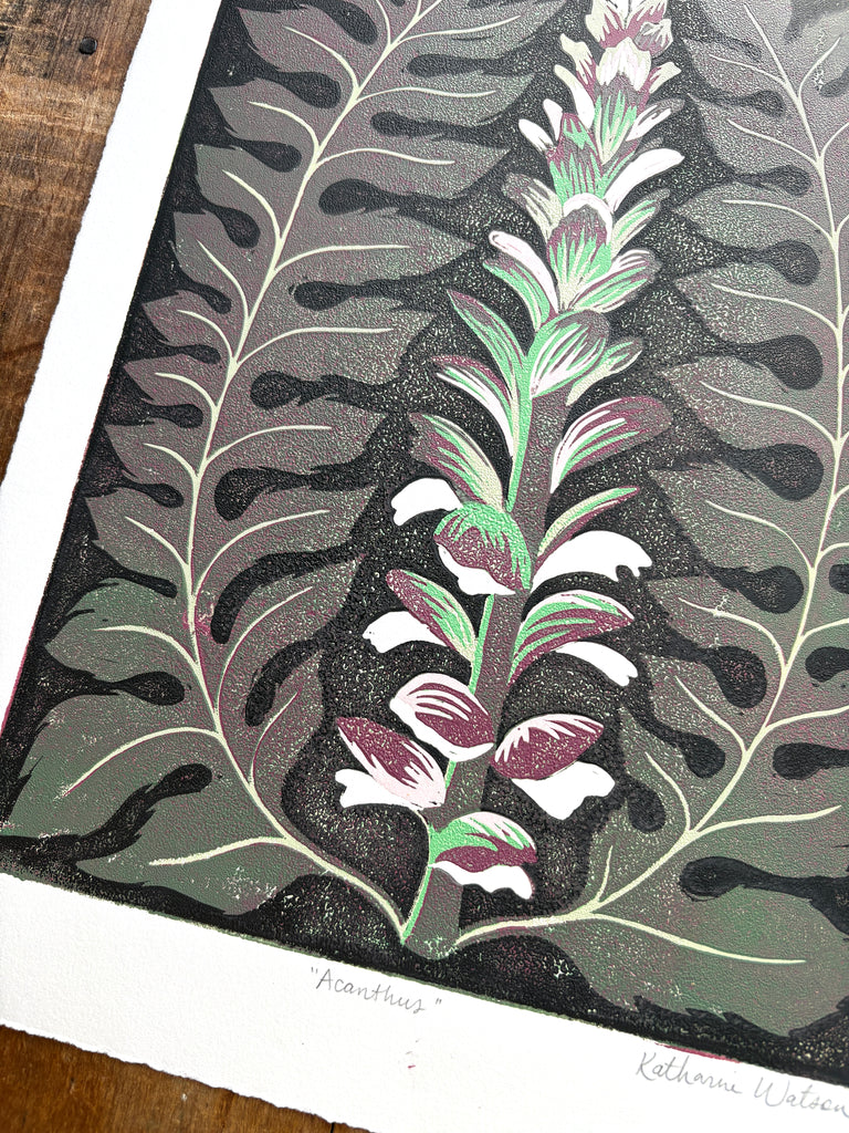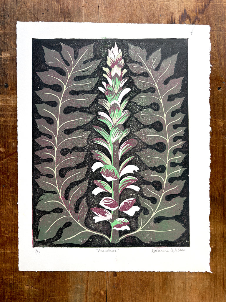 An original Katharine Watson reduction block print featuring an Acanthus plant.