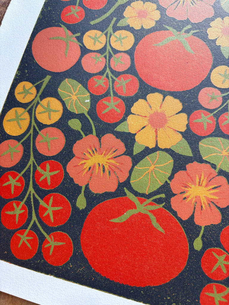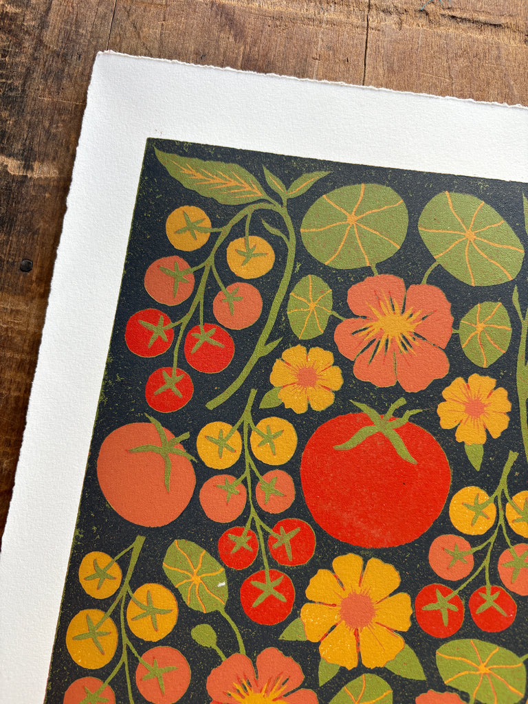 This print is a reduction print, meaning that the same block is carved and printed multiple times, and no more prints can be made once the process is finished. Once this is sold out, it's gone forever! This reduction print has five colors and has been through the press five times.
