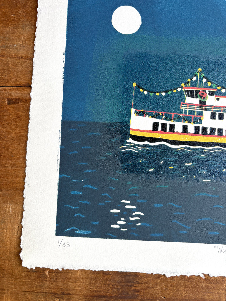 This print is a reduction print, meaning that the same block is carved and printed multiple times, and no more prints can be made once the process is finished. Once this is sold out, it's gone forever! This reduction print has six colors.