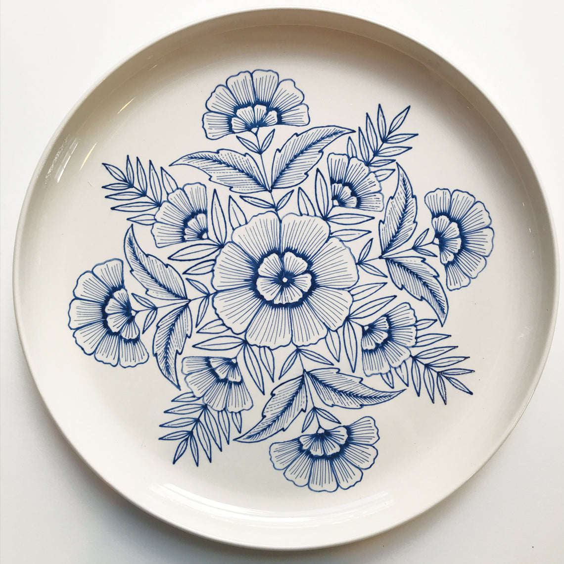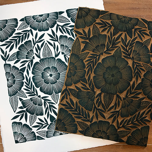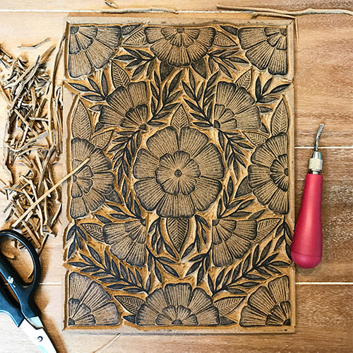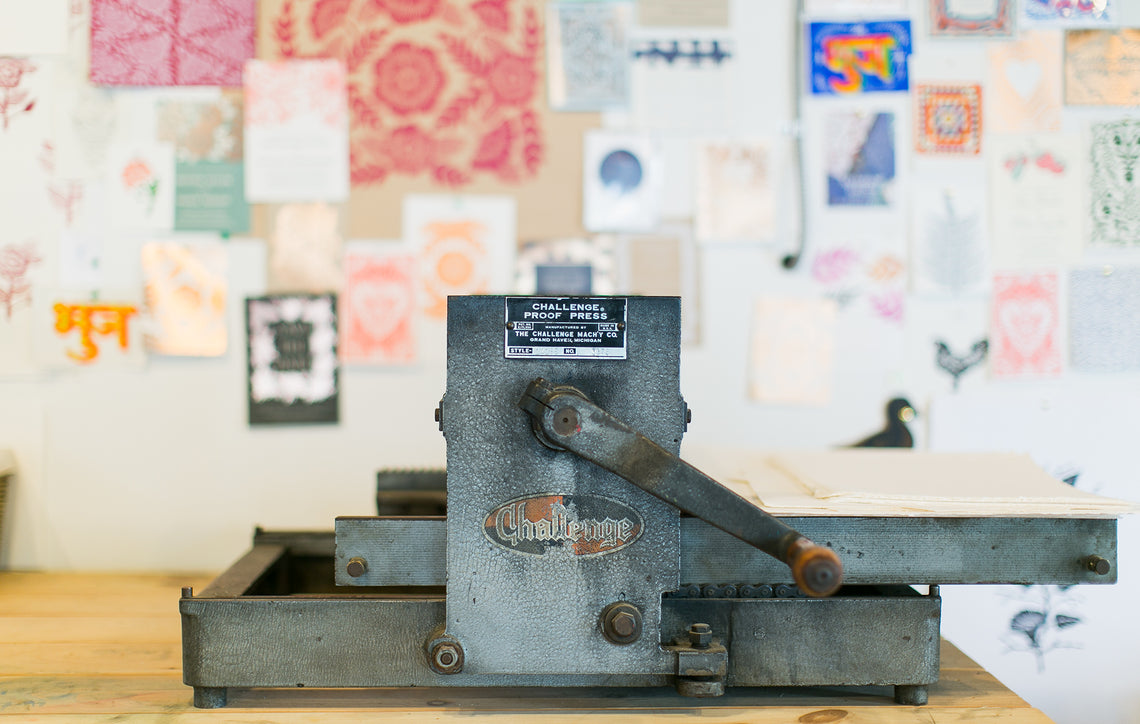 A single small block may take her three to five hours, while larger ones take shape over weeks and months. Every flourish, petal, and detail you see in our prints was slowly and meticulously carved by hand, by Katharine. The finished blocks are then tested and printed on our hand-fed, hand-cranked presses that date back to the 1920s.